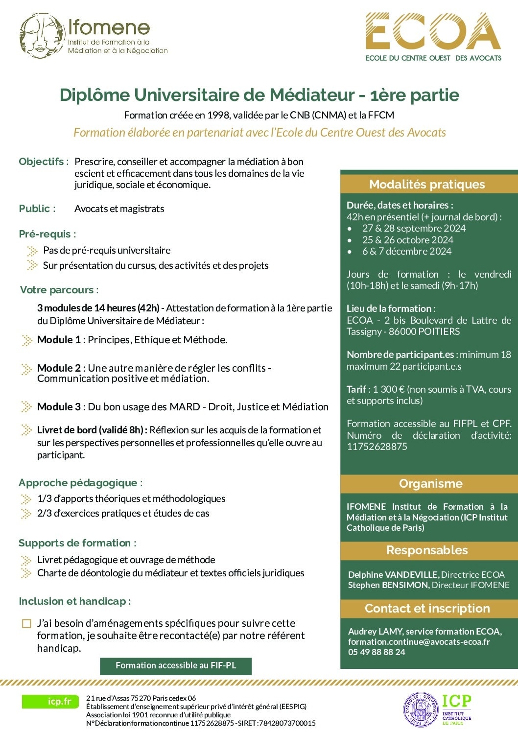 Aussi, l’ÉCOA a développé avec le leader parmi les centres de formation à la médiation et la négociation en France, IFOMENE, un diplôme universitaire de médiateur adapté aux contraintes des avocats en exercice. Les enseignements sont dispensés uniquement le vendredi et le samedi et proposé en deux parties :